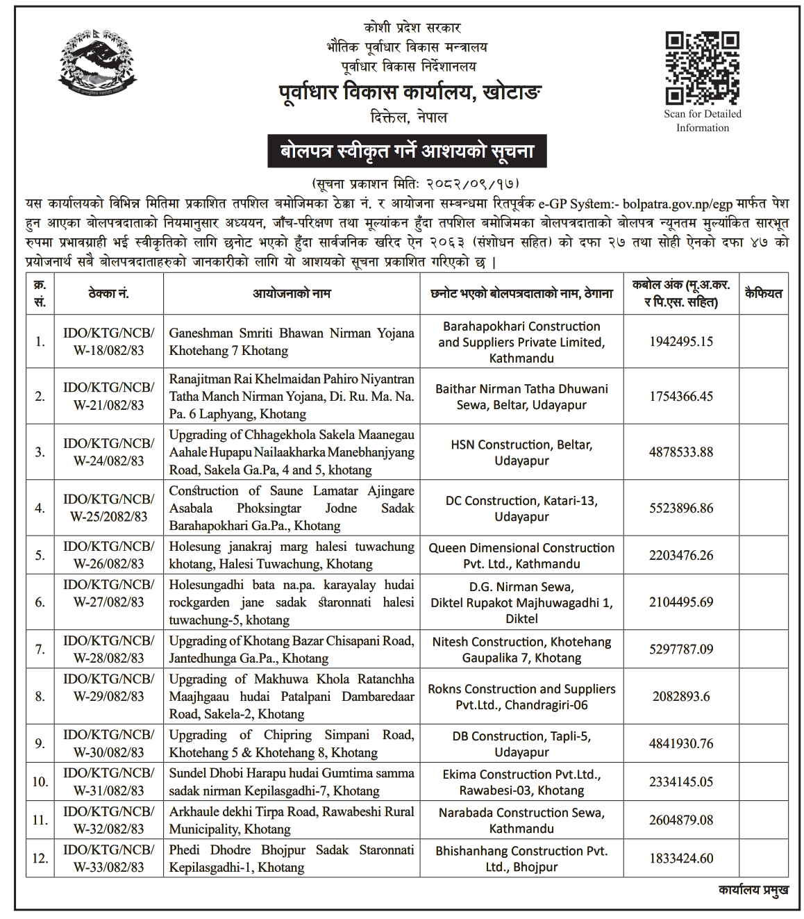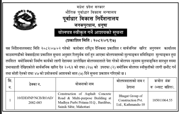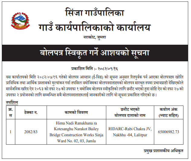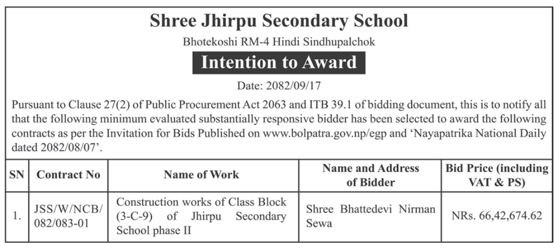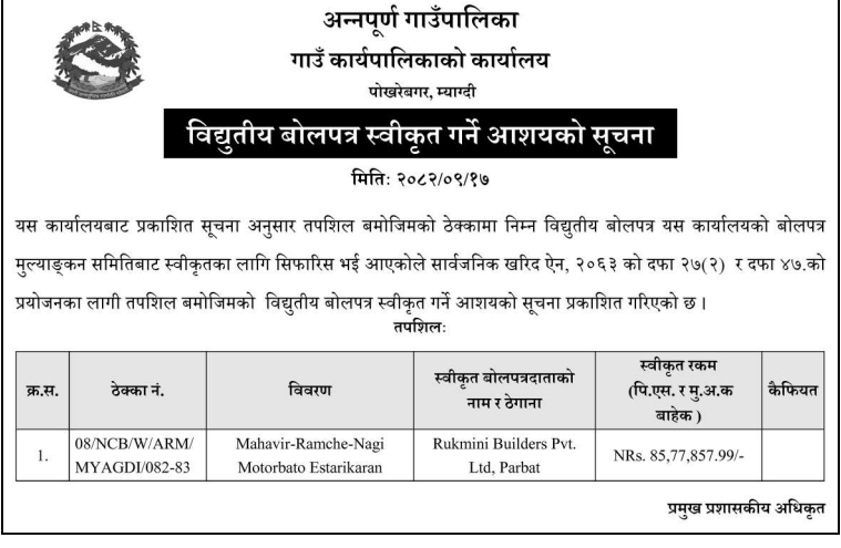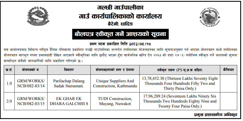 बोलपत्र स्विकृत ; Bid Award (Construction only) 01/01/2025 (Thursday)