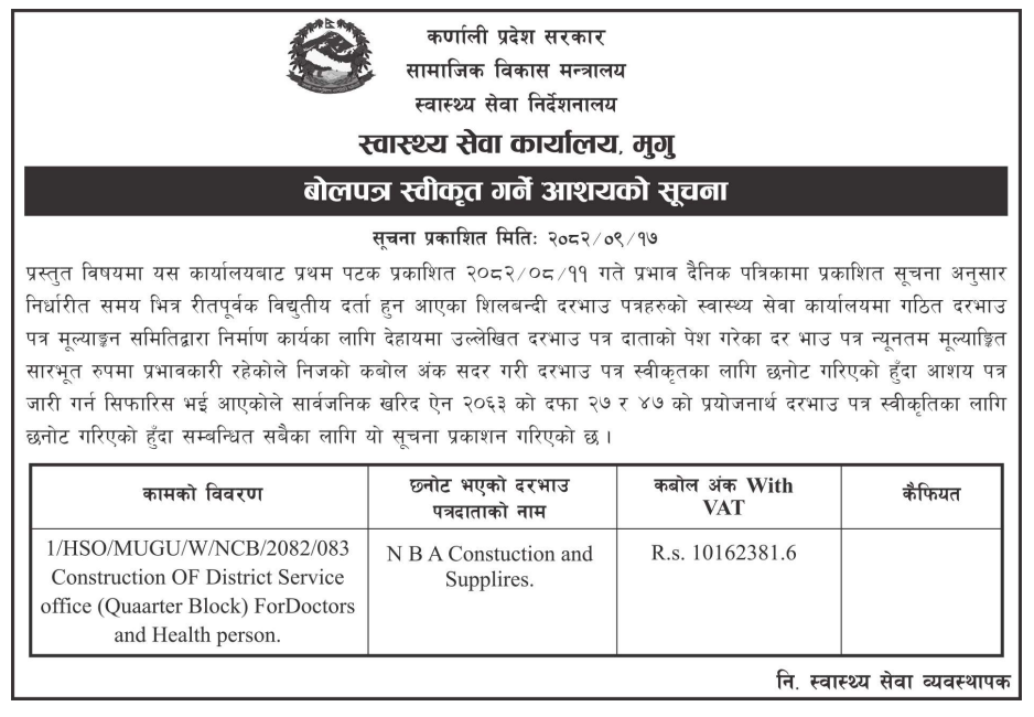 | 117 | Social Development Office, Salyan | Construction Building Of Sejawaltakura Health Post Sharada-04, Salyan | 31/12/2025 | PPMO | 01/02/2026 | Click Here | |