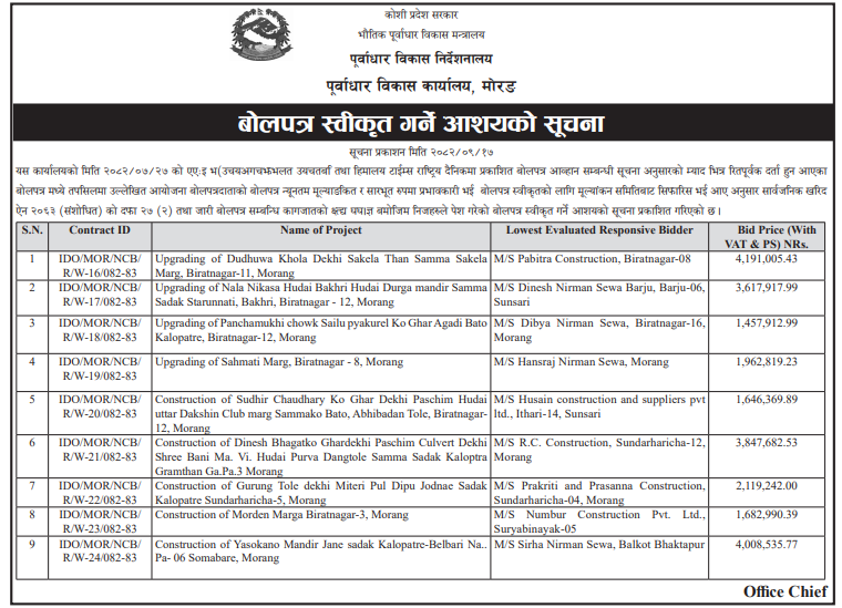 | 169 | Urlabari Municipality Office; Morang; | Balbisauni ma sidewall Nirman,Rae tole adhuro sidewall tatha marmat urlabari-8 morang | 31/12/2025 | PPMO | 16/01/2026 | Click Here | |
