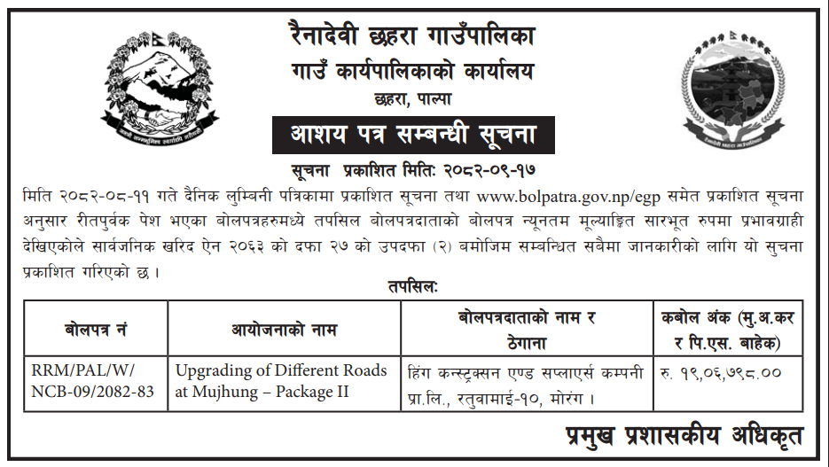 - Award Notice : Road Upgrading Work At Various Places (Swornikita Construction and Suppliers, Gatishil-Gravity JV) |
