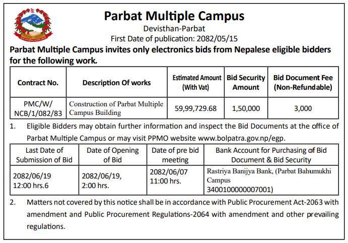 | 14 | Parbat Multiple Campus | Construction of Parbat Multiple Campus building | 31/08/2025 | PPMO | 05/10/2025 | Click Here | |