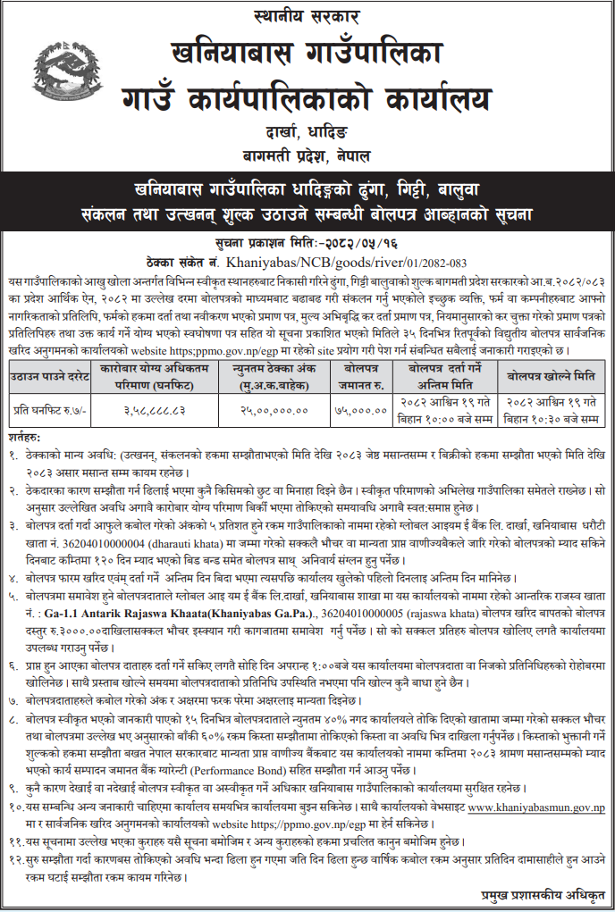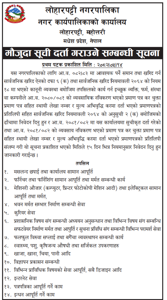 | 37 | Barbardiya Municipality | Procurement and Supply of Essential Medicine for Health Insurance Program | 31/08/2025 | PPMO | 15/09/2025 | Click Here | |