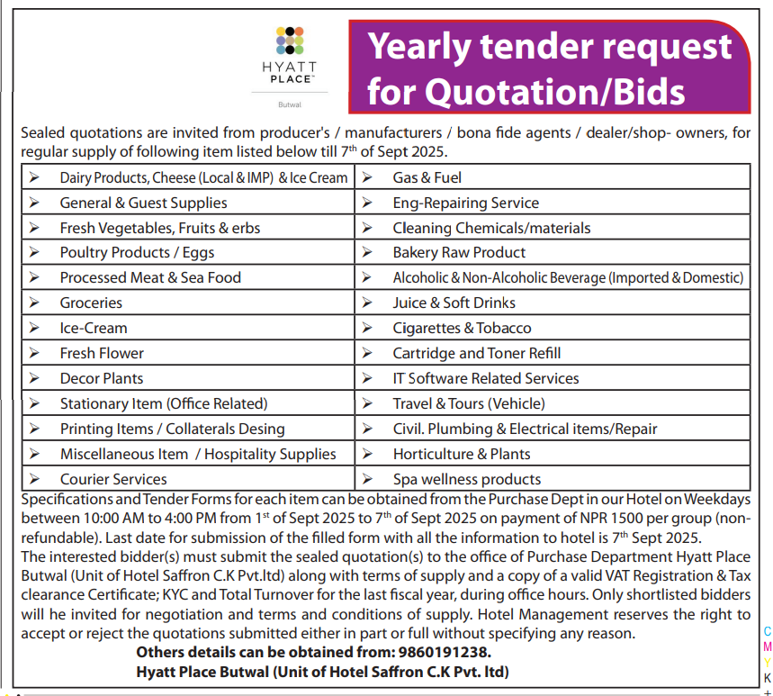| 30 | Tara Gaon Development Board,Kathmandu | Procurement and Supply of Hospitality Sector Human Resources through Outsourcing for Canteen Operation at Ministry of Finance Kathmandu Singhadurbar | 31/08/2025 | PPMO | 08/10/2025 | Click Here | |