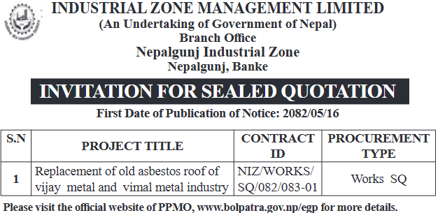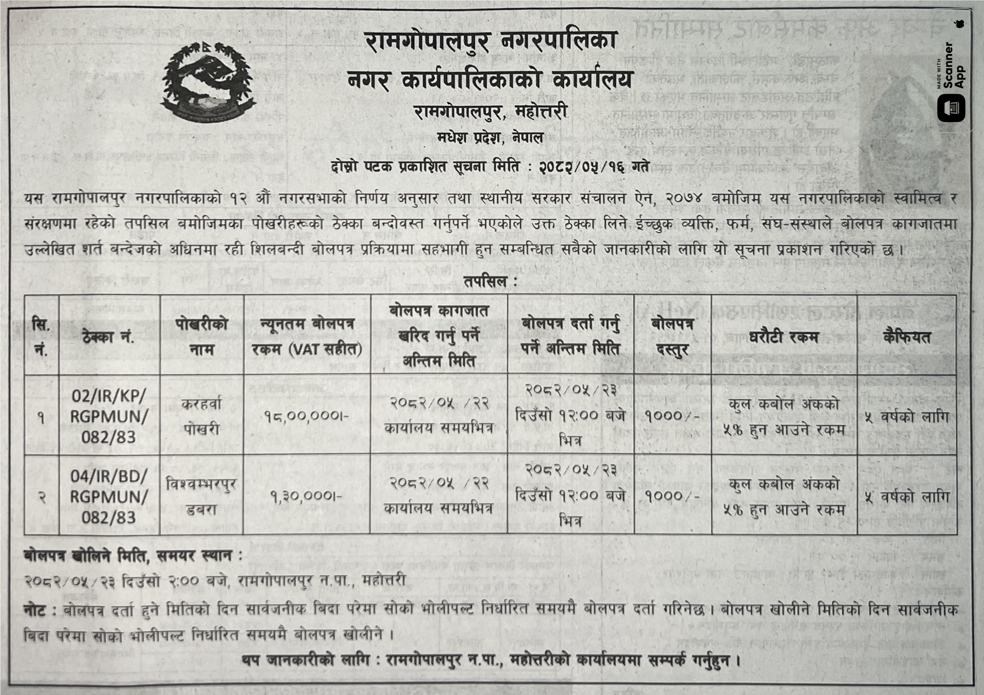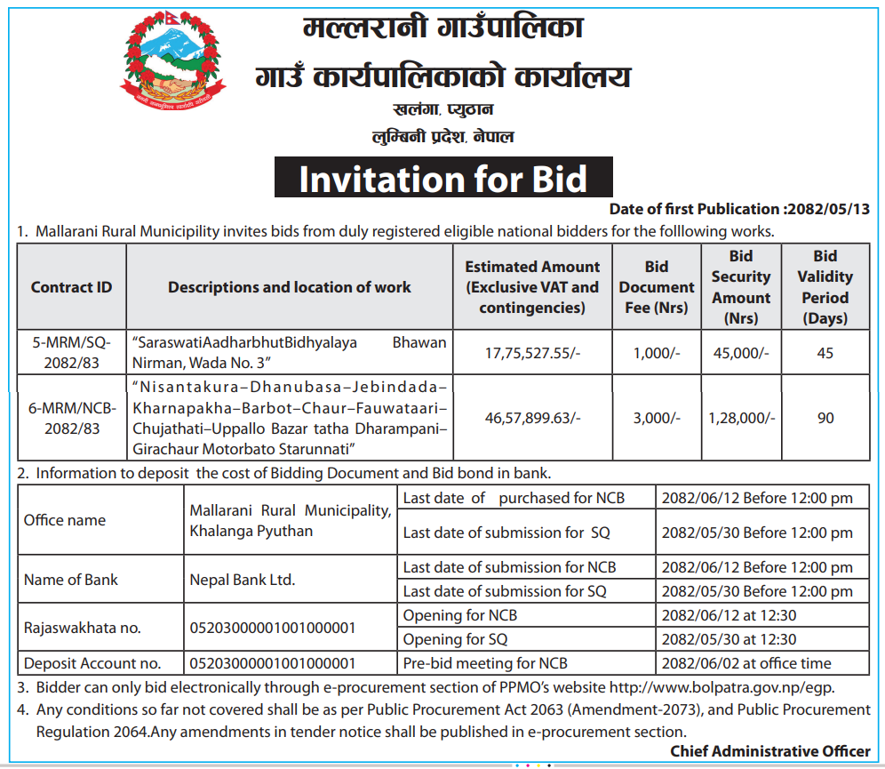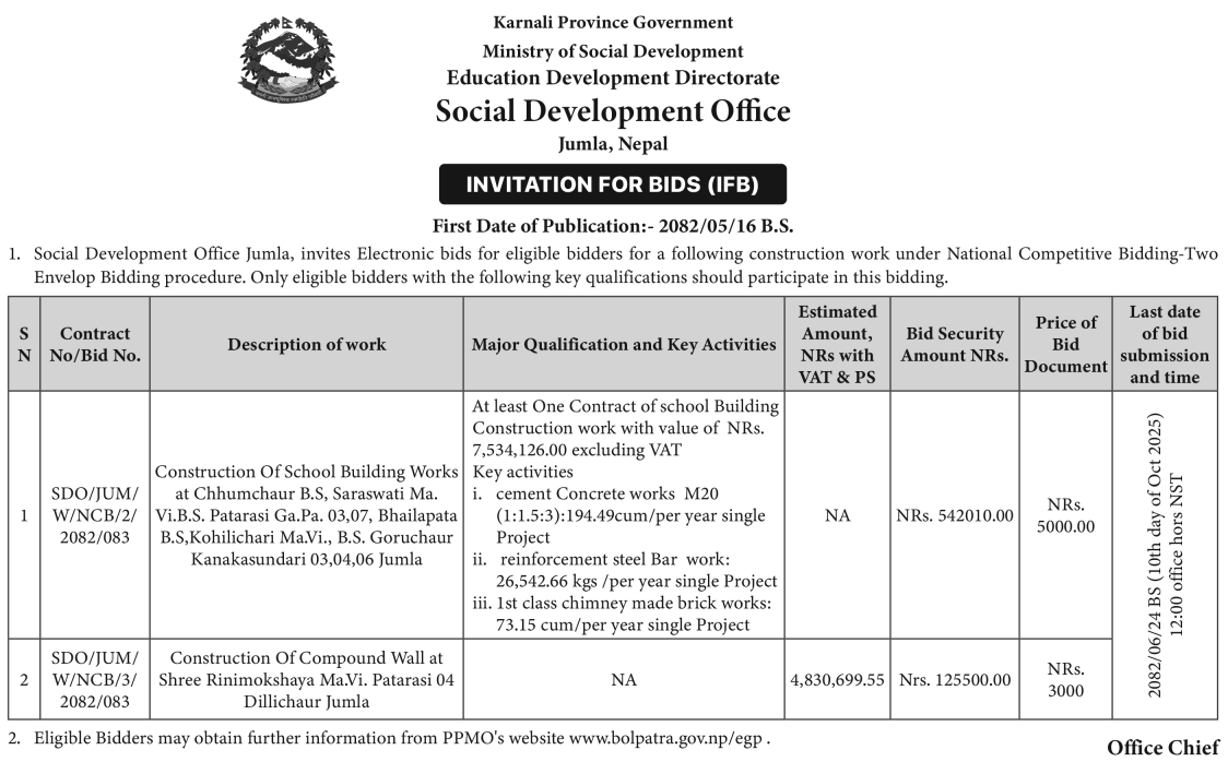 | 6 | Narainapur Rural Municipality | Construction of Two Storey RCC Framed Structure School Building and other Infrastructure works at Aadarsh Secondary School, Laxmanpur, Narainapur -2, Banke | 31/08/2025 | PPMO | 06/10/2025 | Click Here | |