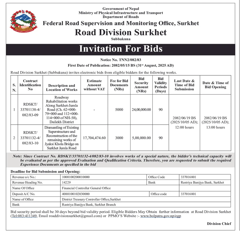 | 25 | 405 Division Road Office Surkhet | Rehabilitation works Along Surkhet-Jumla Road (Ch. 62+000-79+000 and 112+000-114+000 of NH-58), Dailekh District. C.I.N.: RDSKT/33701138-4/082/83/-09 | 31/08/2025 | PPMO | 05/10/2025 | Click Here | |