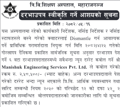 | 26 | 405 Division Road Office Surkhet | Dismantling of Existing Superstructure and Reconstruction of the remaining works of Jyaksi Khola Bridge on Surkhet-Jumla Road (Ch. 115+000), Dailekh District (after termination of original contract). | 31/08/2025 | PPMO | 05/10/2025 | Click Here | |