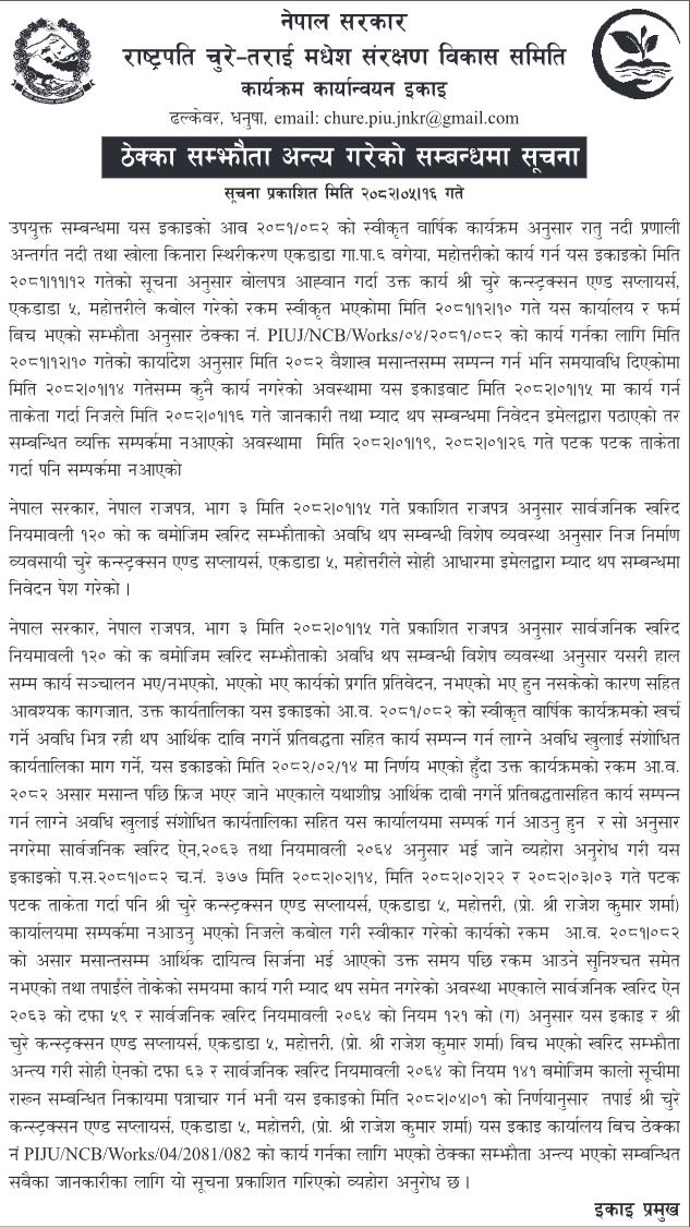 - Award Notice : Road Upgrading Work At Various Places (Swornikita Construction and Suppliers, Gatishil-Gravity JV) |