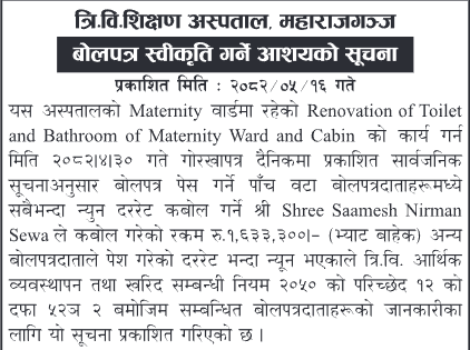| 38 | Barbardiya Municipality | Procurement and Supply of Laboratory chemicals and Surgical items for Barbardiya Nagar Hospital | 31/08/2025 | PPMO | 15/09/2025 | Click Here | |