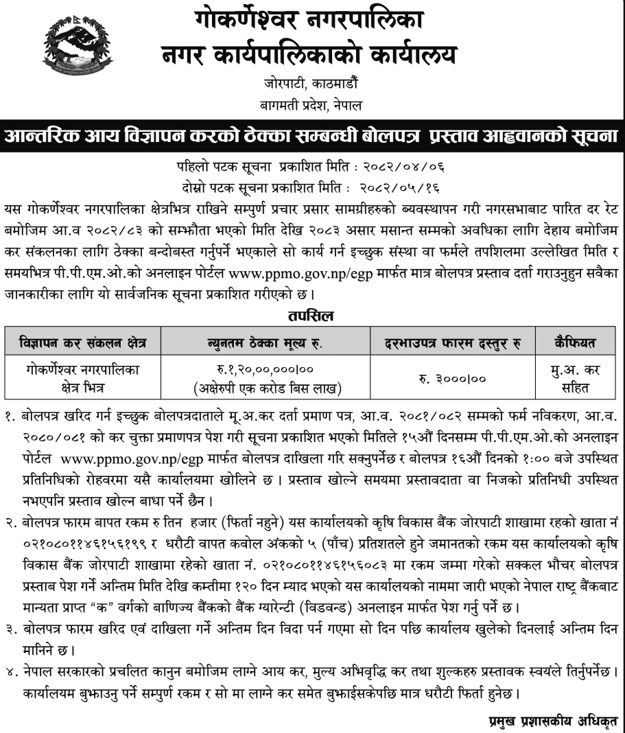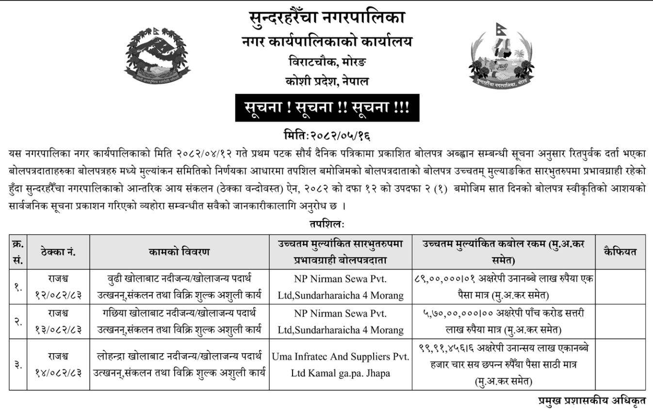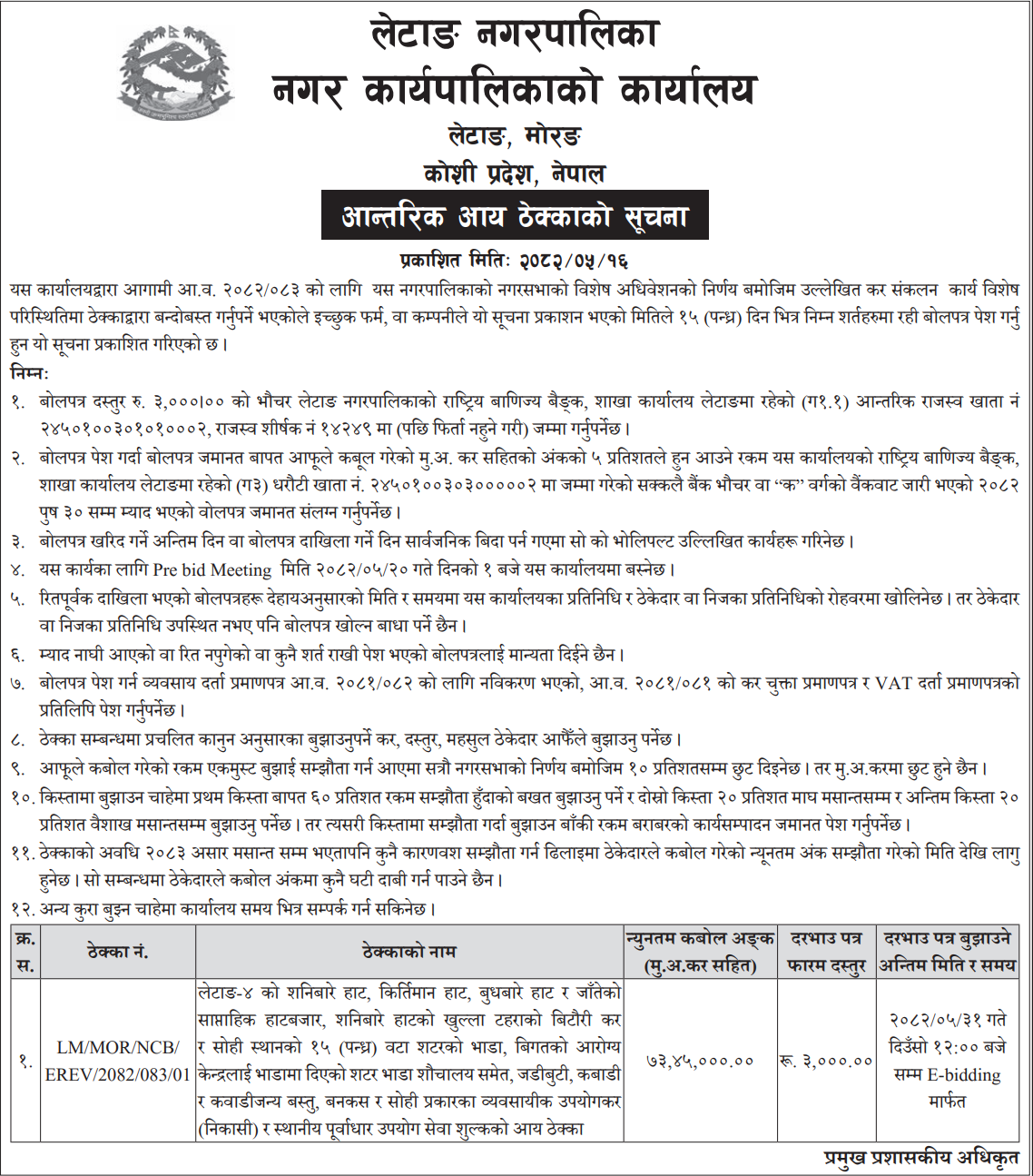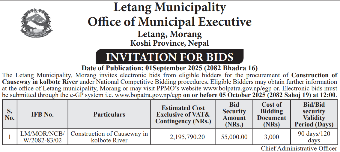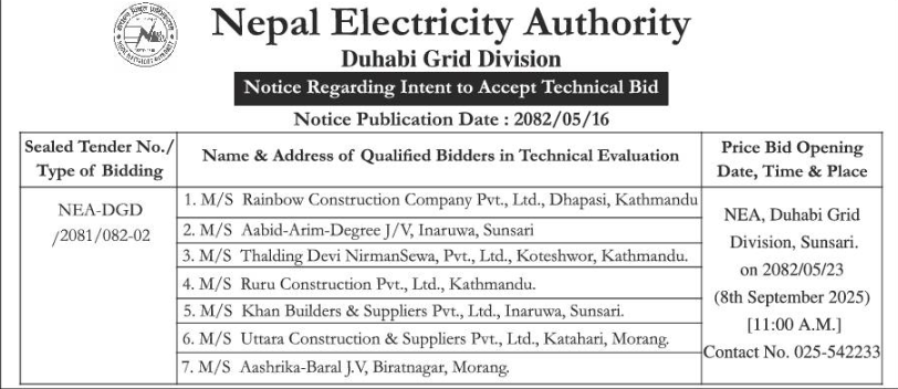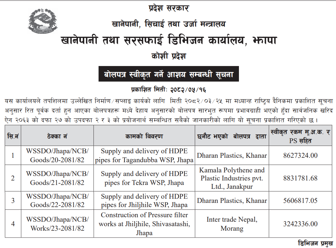 निर्माण सम्बन्धी प्रकाशित सम्पूर्ण ठेक्का टेन्डर तथा बोलपत्र सुचनाहरु प्रदेश अनुसार 01/09/2025 (Monday)