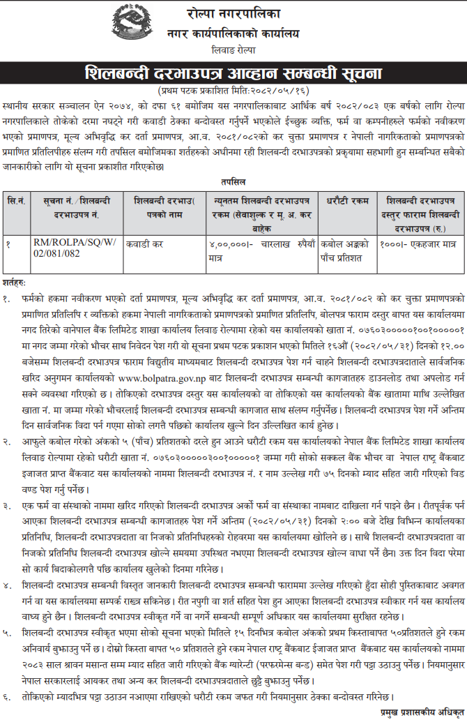 | 22 | 302 Division Road Office Pokhara | Road Upgrading Works on Waling KafalDanda GarauSur Mandir Hudei Rogdithanti Chapakot Rampur Palpa Sadak,Syangja | 31/08/2025 | PPMO | 05/10/2025 | Click Here | |
