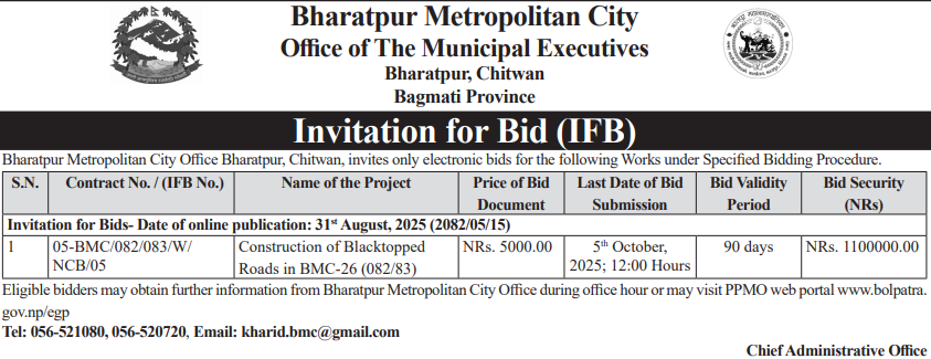 | 7 | Bharatpur Metropolitian City Office | Construction of Blacktopped Roads in BMC-26 (082/83) | 31/08/2025 | PPMO | 05/10/2025 | Click Here | |