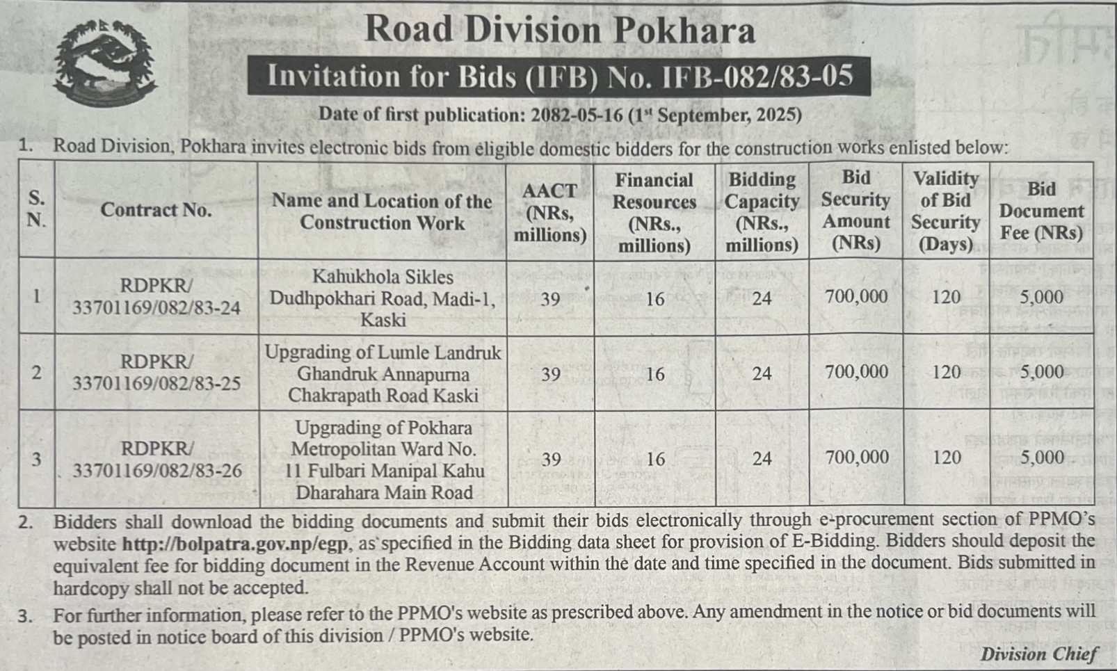 | 10 | 302 Division Road Office Pokhara | Upgrading of Road along Deurali-Phedi-Ramdi Maudanda-Fechok Rupa Ga.Pa.3,4,5 and Idi 4 chok, Kaski.; RDPKR/33701169/082/83-23 | 31/08/2025 | PPMO | 05/10/2025 | Click Here | |