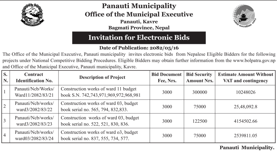 | 2 | Panauti Municipality | Kalati gagal chautara samma tatabandhan nirman panauti 12 | 31/08/2025 | PPMO | 09/10/2025 | Click Here | |