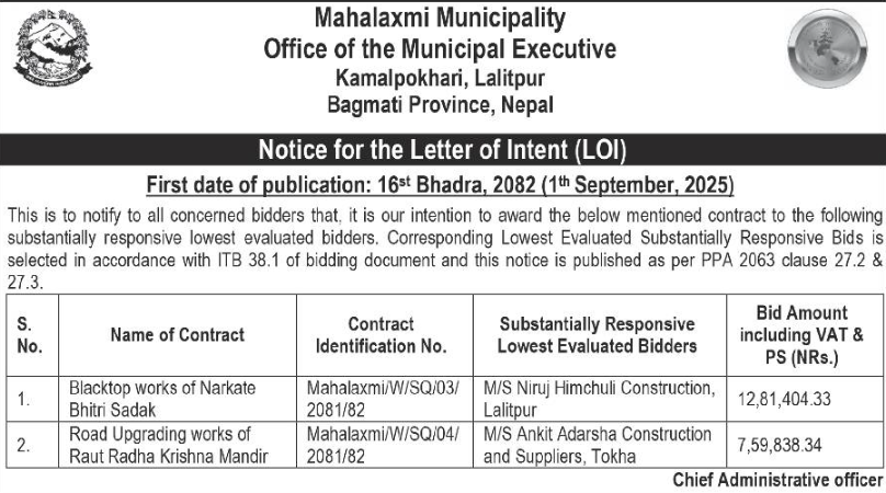 | 3 | Panauti Municipality | Upgrading of chhap chindu road panauti 12 | 31/08/2025 | PPMO | 09/10/2025 | Click Here | |