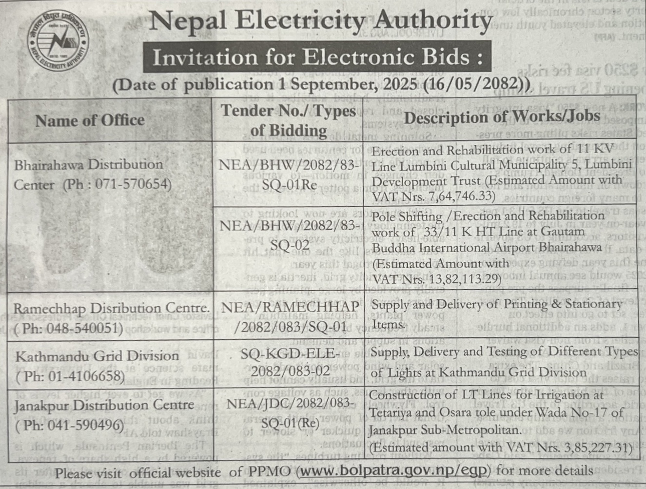 | 32 | NEA, Koshi Provincial Office | Supply and Delivery of Transformer Oil | 31/08/2025 | PPMO | 08/10/2025 | Click Here | |