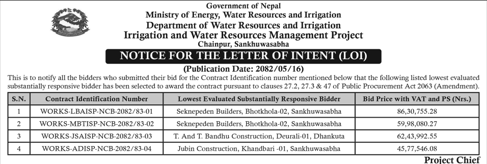 प्रदेश ३ मा प्रकाशित निर्माण सम्बन्धी बोलपत्र तथा आशयका सुचनाहरु