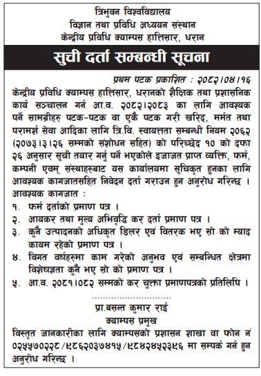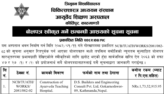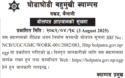 | 47 | Federal Secretariat Construction & Management Office | Supplying of pipes and submersible pump for deep boring at Krishna Prasad Bhattarai Ashram, Badegaun, Lalitpur | 01/08/2025 | PPMO | 17/08/2025 | Click Here | |