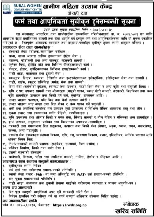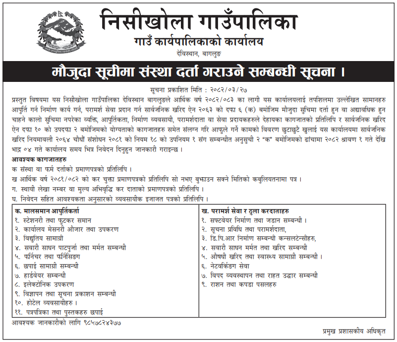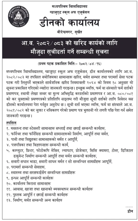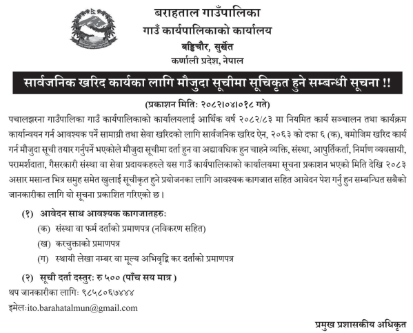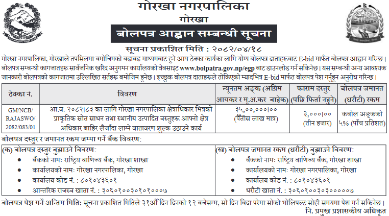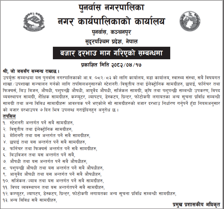 | 63 | Geruwa Rural Municipality | Purchasing of medicine and surgical Items for geruwa rural municipality | 01/08/2025 | PPMO | 31/08/2025 | Click Here | |