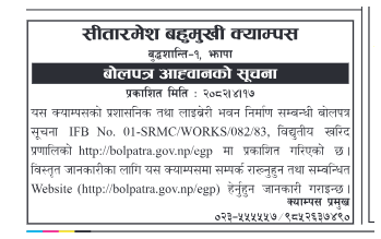 | 71 | Federal Secretariat Construction & Management Office | Supplying of pipes and submersible pump for deep boring at Krishna Prasad Bhattarai Ashram, Badegaun, Lalitpur | 01/08/2025 | PPMO | 17/08/2025 | Click Here | |