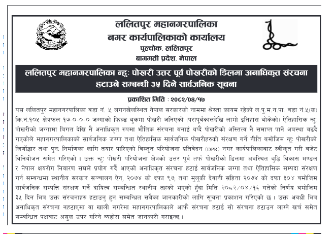 | 26 | Gangajamuna Rural Municipality | Palika Lokmarga (Bhagwatisthan Sadhan Pokhara Chimchowk) | 01/08/2025 | PPMO | 31/08/2025 | Click Here | |