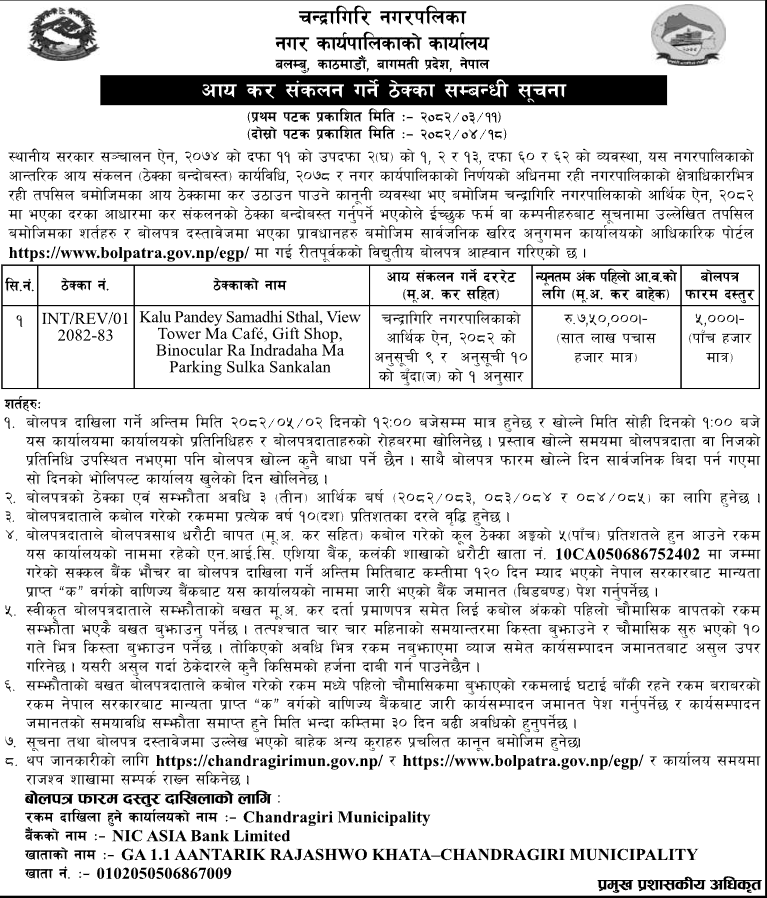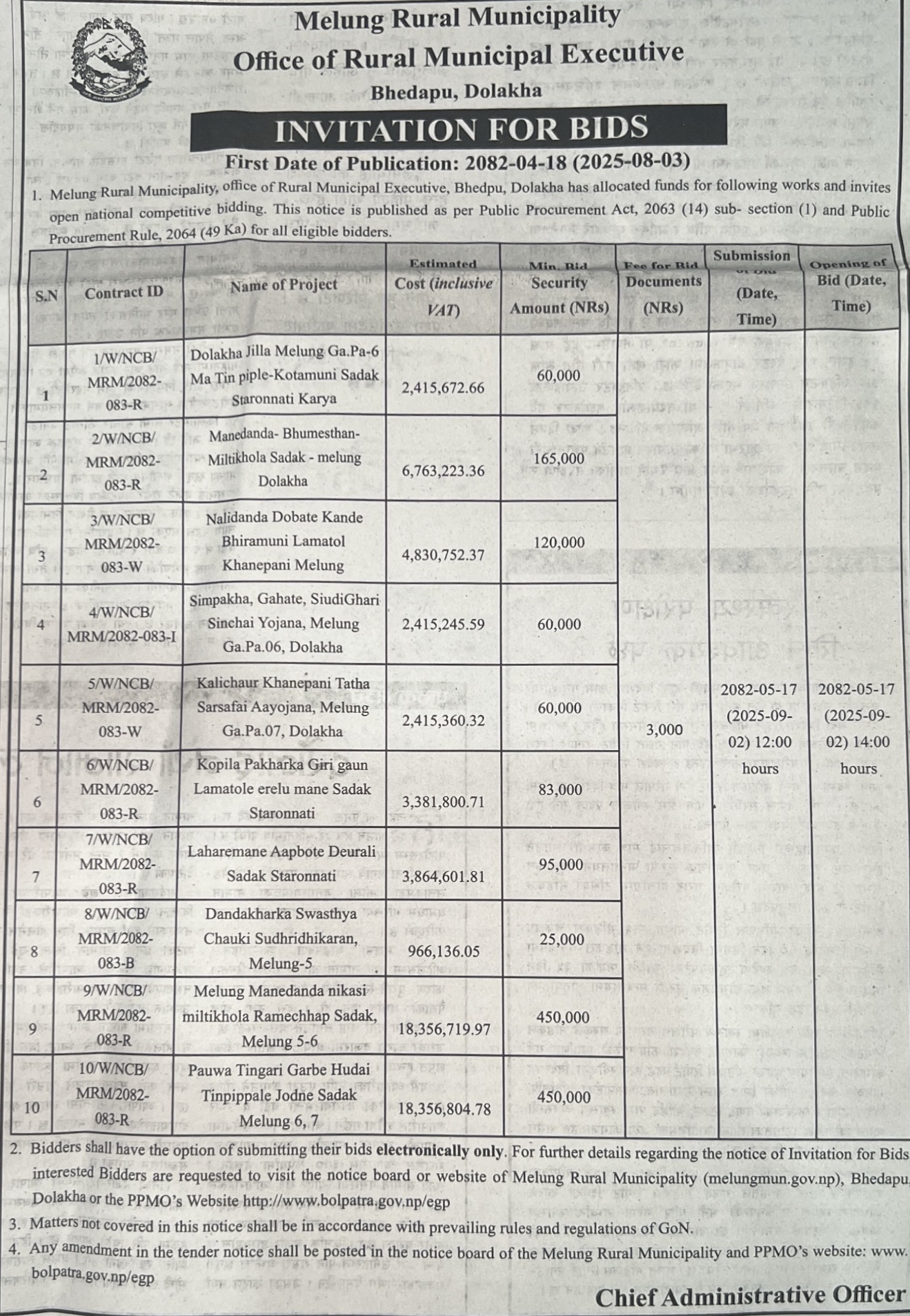 | 2 | Khumbu Pasanglhamu Rural Municipality, Solukhumbu | Surke- Nasagara-Muse-Chaurikharak(Gaupalika) Road construction | 01/08/2025 | PPMO | 01/09/2025 | Click Here | |
