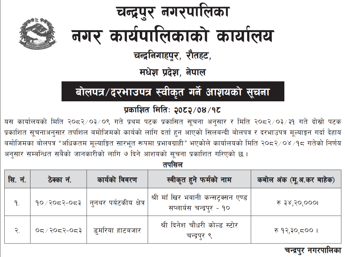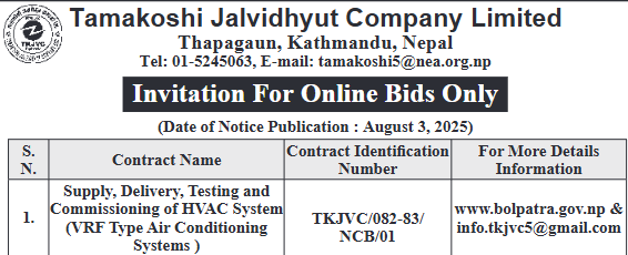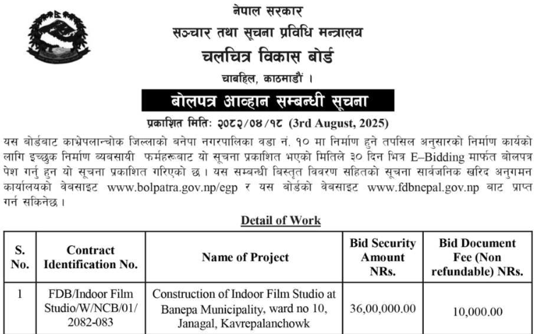 निर्माण सम्बन्धी प्रकाशित सम्पूर्ण ठेक्का टेन्डर तथा बोलपत्र सुचनाहरु प्रदेश अनुसार 03/08/2025 (Sunday)