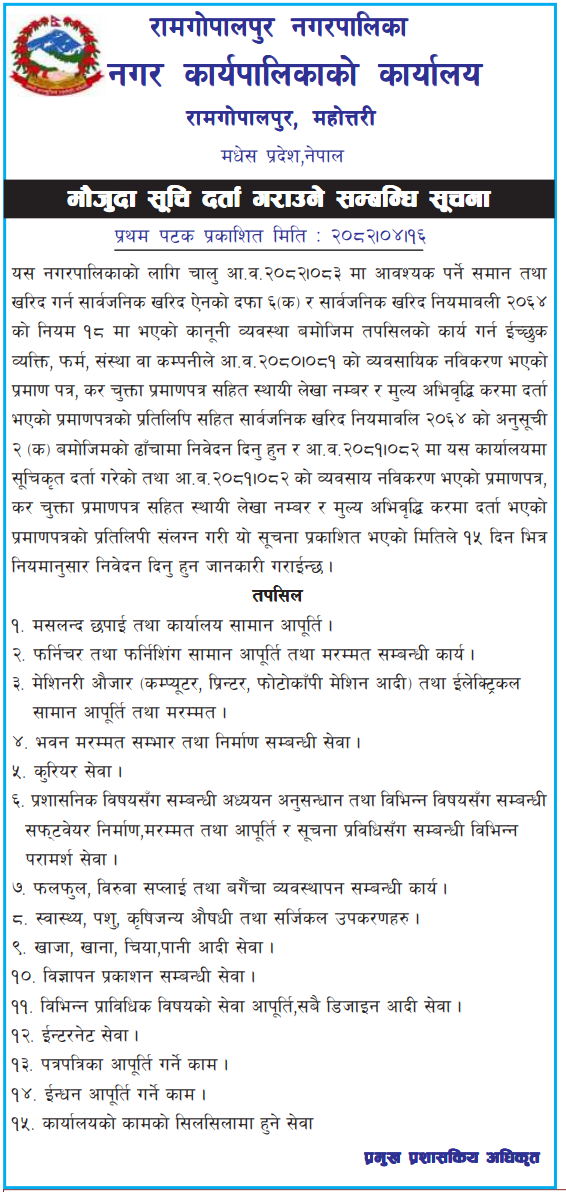 | 58 | Duhabi Municipality | Supply & Delivery of Insurance Medicine & Medical Accessories | 01/08/2025 | PPMO | 31/08/2025 | Click Here | |