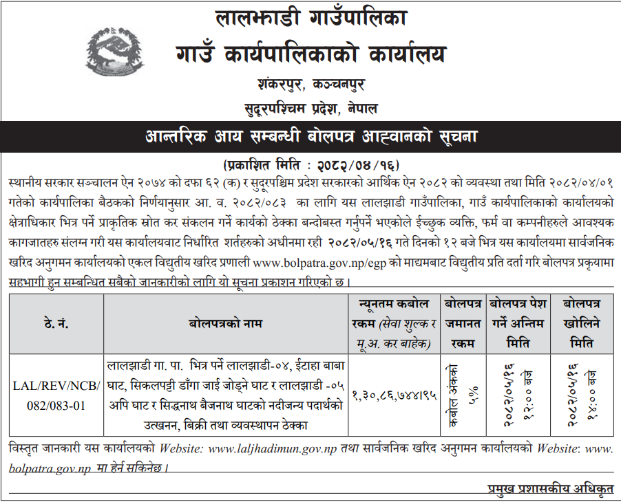| 56 | LALJHADI RURAL MUNICIPALITY | Extraction of River Materials In Laljhadi Doda River | 01/08/2025 | PPMO | 01/09/2025 | Click Here | |