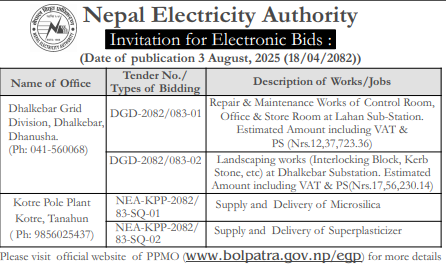| 46 | NEA, Lumbini Province Division Office | Maintenance of transformer workshop building | 01/08/2025 | PPMO | 18/08/2025 | Click Here | |