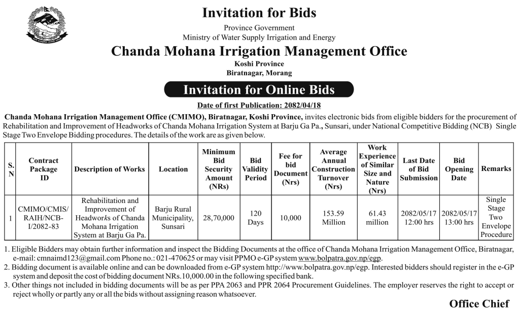 प्रदेश ३ मा प्रकाशित निर्माण सम्बन्धी बोलपत्र तथा आशयका सुचनाहरु