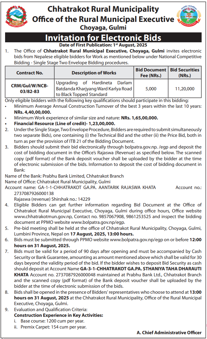 | 22 | Chhatrakot Rural Municipality | Upgrading of Hardineta Darlam Batdanda Kharjyang ward Karlya road to BlackTopped Standard | 01/08/2025 | PPMO | 31/08/2025 | Click Here | |