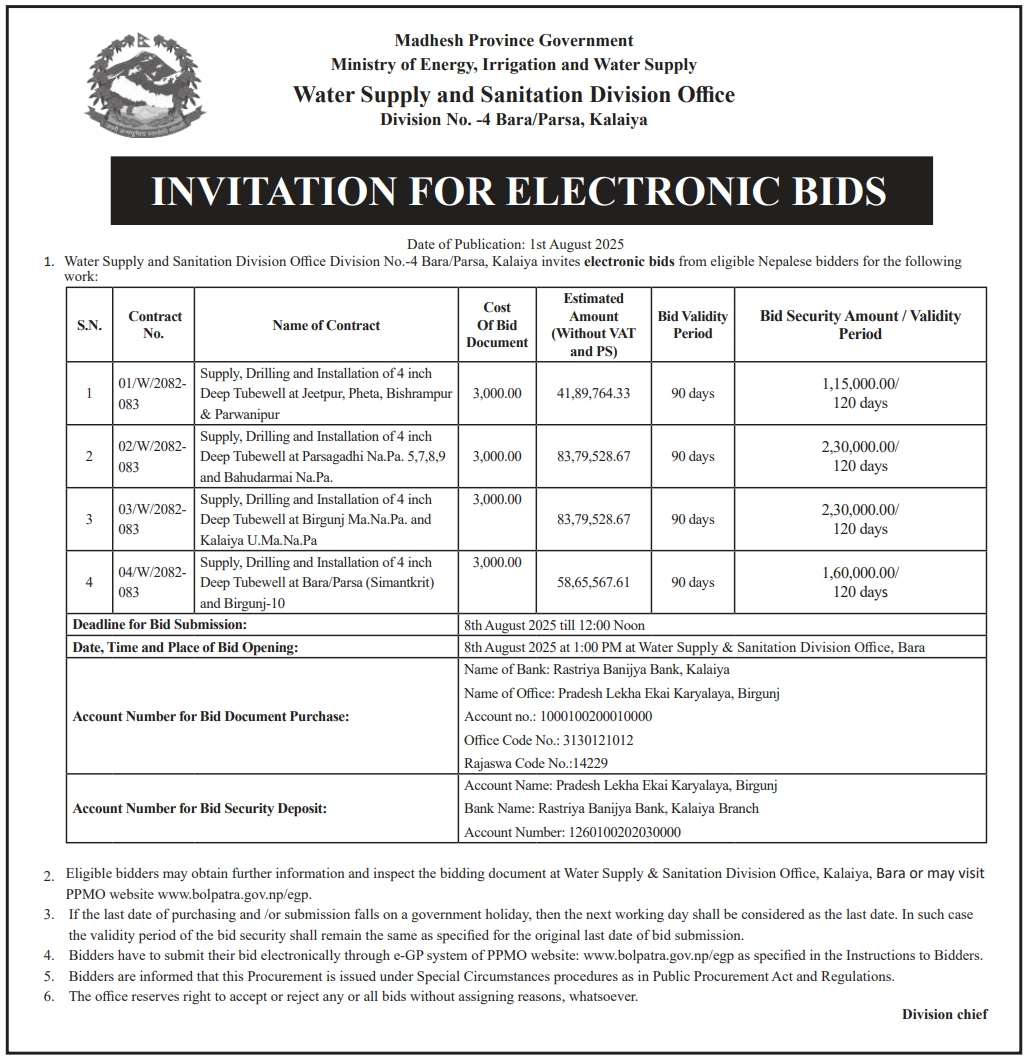 | 52 | Water Supply and Sanitation Division Office, Bara | Supply, Drilling and Installation of 4 inch Deep Tubewell at Bara/Parsa (Simantkrit) and Birgunj-10 | 01/08/2025 | PPMO | 08/08/2025 | Click Here | |