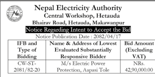| 70 | NEA, Lumbini Province Division Office | Transportation of Electrical Line Materials from Central Store Hetauda to NEA Store Nepalgunj | 01/08/2025 | PPMO | 18/08/2025 | Click Here | |