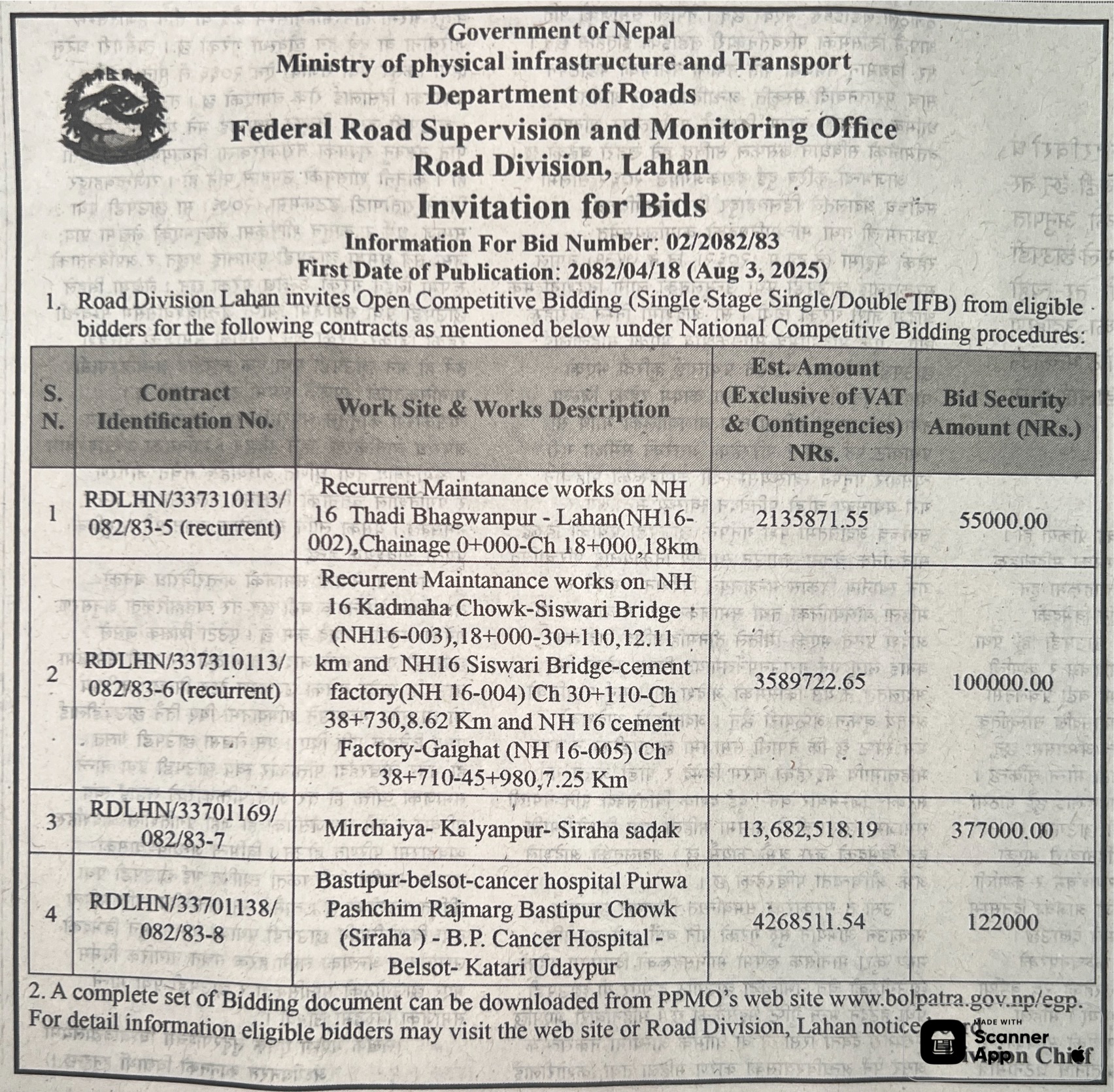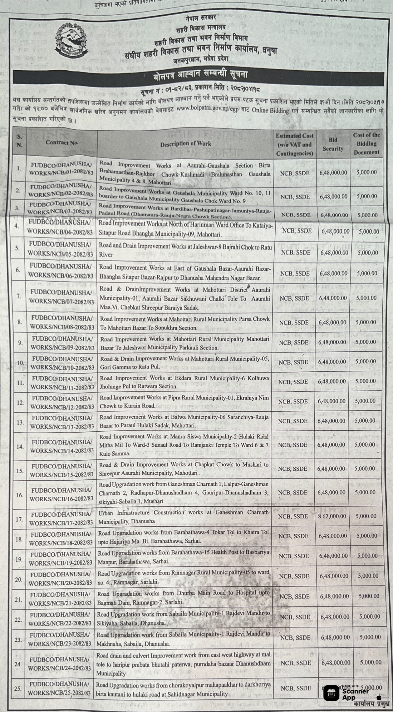 | 48 | Infrastructure Development Office, Mahottari | Construction of Pateli Suga Simardahi Prakauli Sadak | 01/08/2025 | PPMO | 17/08/2025 | Click Here | |