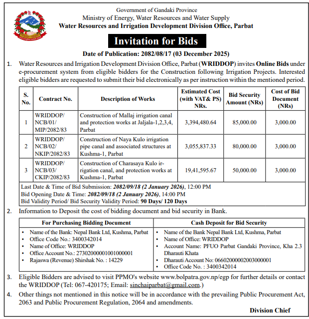 | 236 | Water resource and Irrigation Development Division, Palpa | Construction of RCC Core wall, Canal and Asociated Structures of Tari Kulo IP, Rambha-3 & Badahare Raiya IP, Rambha-4 | 03/12/2025 | PPMO | 18/12/2025 | Click Here | |