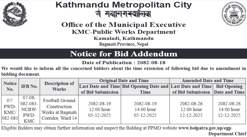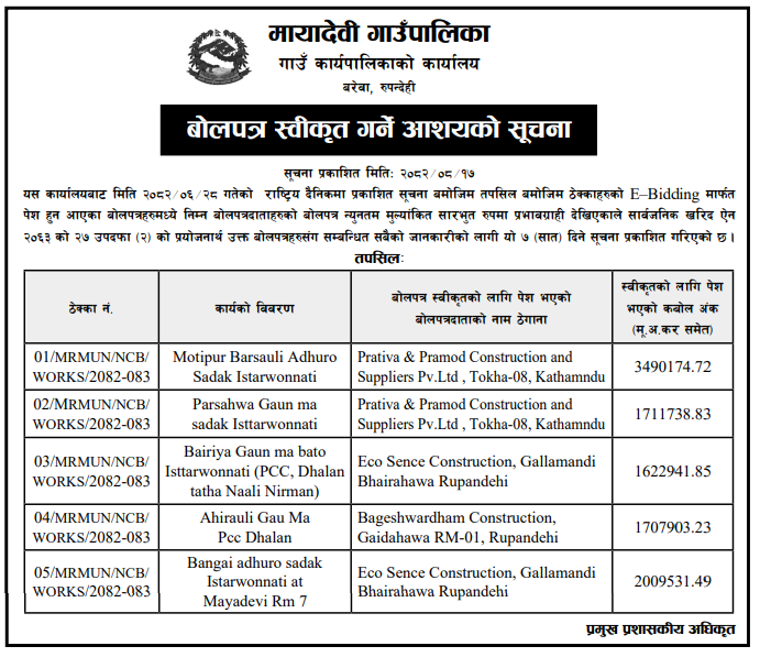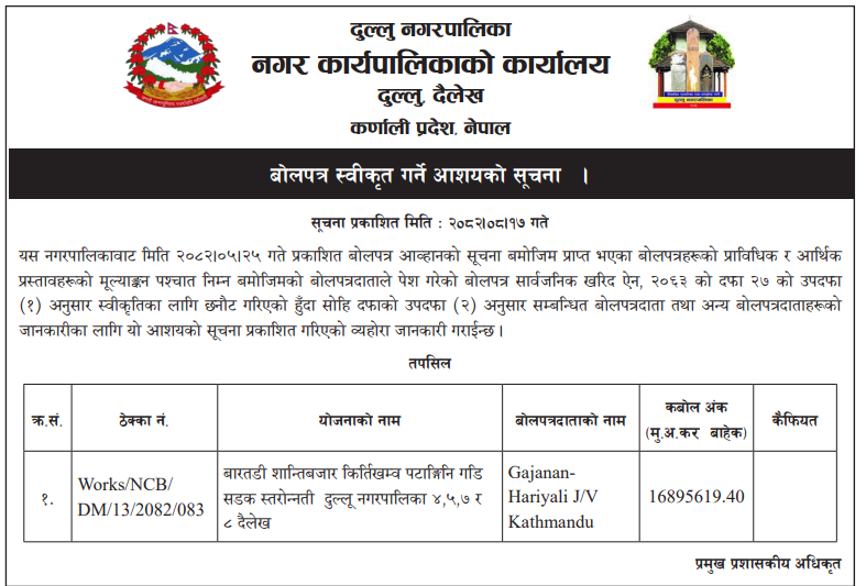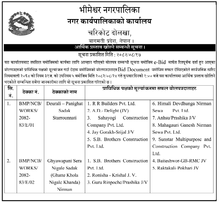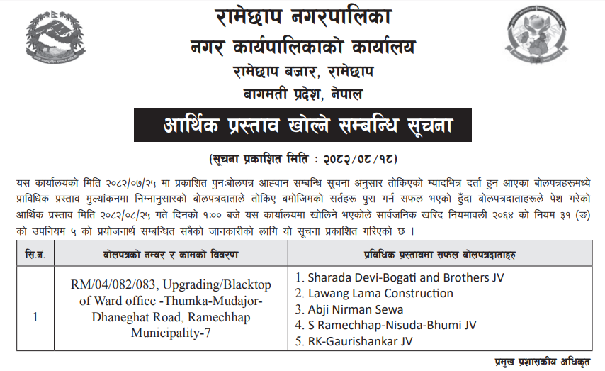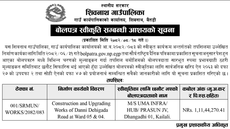 | 9 | Mandandeupur Municipality | Higuwapati Sallebas Sadakko Higuwapati Sadak Khanda Marmat | 03/12/2025 | PPMO | 04/01/2026 | Click Here | |