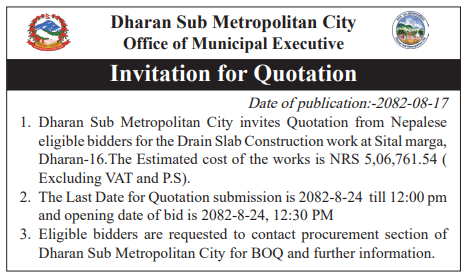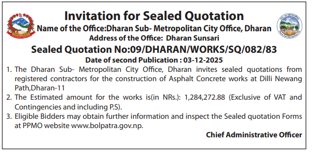 | 15 | Infrastructure Development Office, Sunsari | Dhanpuri Shiv Mandir Dekhi Saraswati Ma Vi Sammako Bato Kalopatre (Saraswati Ma. Vi. Agadi wall Nirman) Barahkshetra 4 Jamtoki, Sunsari & Shailendra Rajdhami ko ghar hudai purwa paschim Raju Sanjel ra Jit Bahadur Katuwal ko Ghar Samma Drain sahit Bato Nirman, Ramdhuni 6, Sunsari | 03/12/2025 | PPMO | 04/01/2026 | Click Here | |