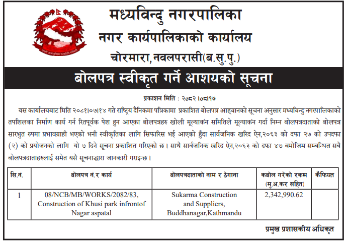 | 189 | Sunwal Municipality Office | Milantol Adhuro Nali Nirman ra Swastha Chowki Istarunnati, Sunwal-08 | 03/12/2025 | PPMO | 18/12/2025 | Click Here | |
