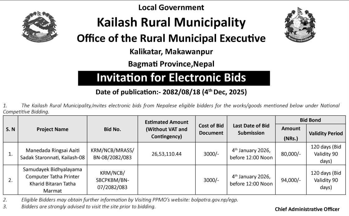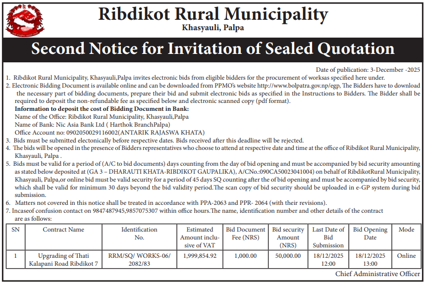 | 50 | Aathbiskot Municipality | Khaphalchaur Ward Karyalaya-Gharikhola Road Rehabilitation and Upgrading Work at Aathbiskot Municipality-10,Rukum (Western Part). | 03/12/2025 | PPMO | 02/01/2026 | Click Here | |