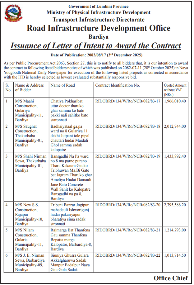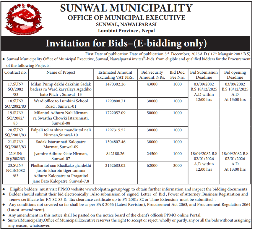 | 188 | Sunwal Municipality Office | Ward office to Lumbini School Road , Sunwal-01 | 03/12/2025 | PPMO | 18/12/2025 | Click Here | |