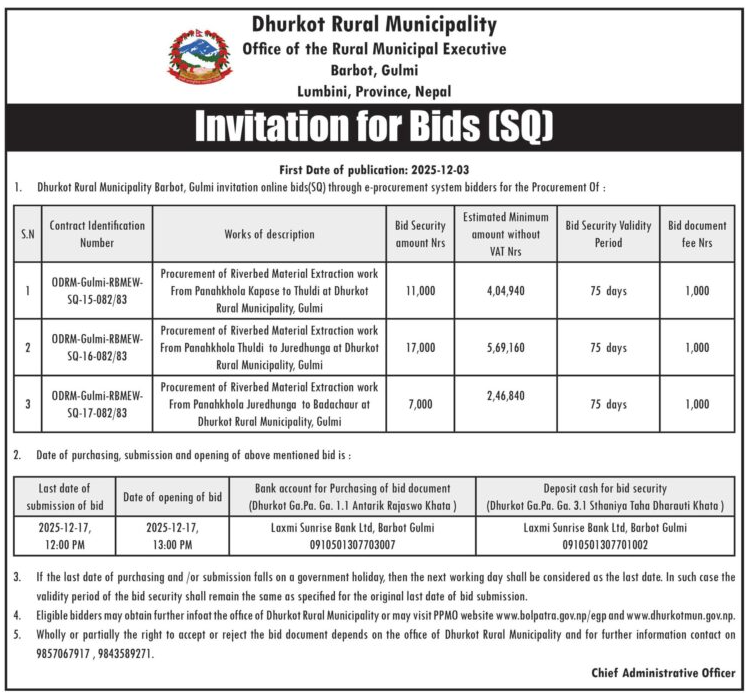| 249 | Office of Dhurkot Rural Municipality, Dhurkot Jaisithok, Gulmi | Riverbed Material Extraction Work form Panahakhola Juredhunga to Badachaur at Dhurkot RM,Gulmi | 03/12/2025 | PPMO | 17/12/2025 | Click Here | |