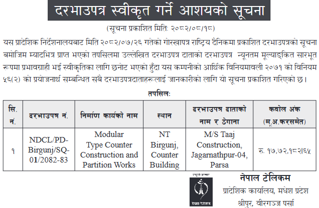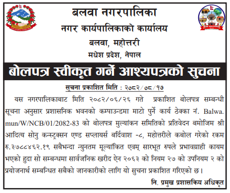 | 38 | Sunwal Municipality Office | Phulbaritol ram Khadkako ghardekhi jusbin kharbin tiger samma Adhuro Kalopatre ra Pragatitol jane Bato Kalopatre, Sunwal-7,8 | 03/12/2025 | PPMO | 02/01/2026 | Click Here | |