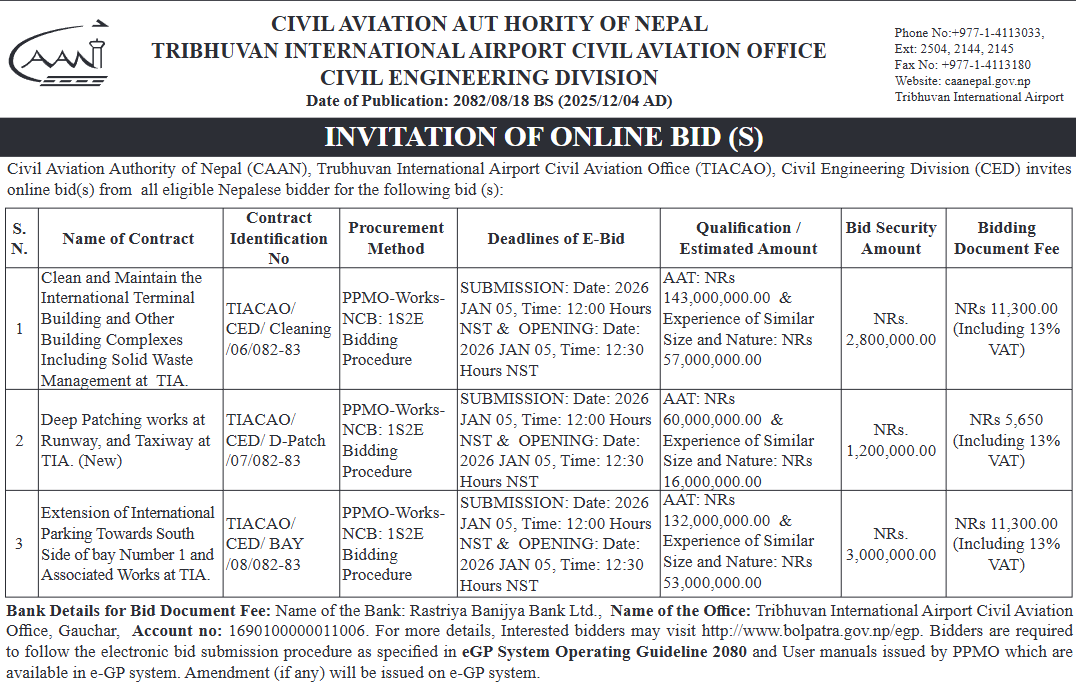 | 267 | Nepal Haj Committee Sachibalaya | Air tickets for hajj pilgrims of 2026 A.D. | 03/12/2025 | PPMO | 02/01/2026 | Click Here | |