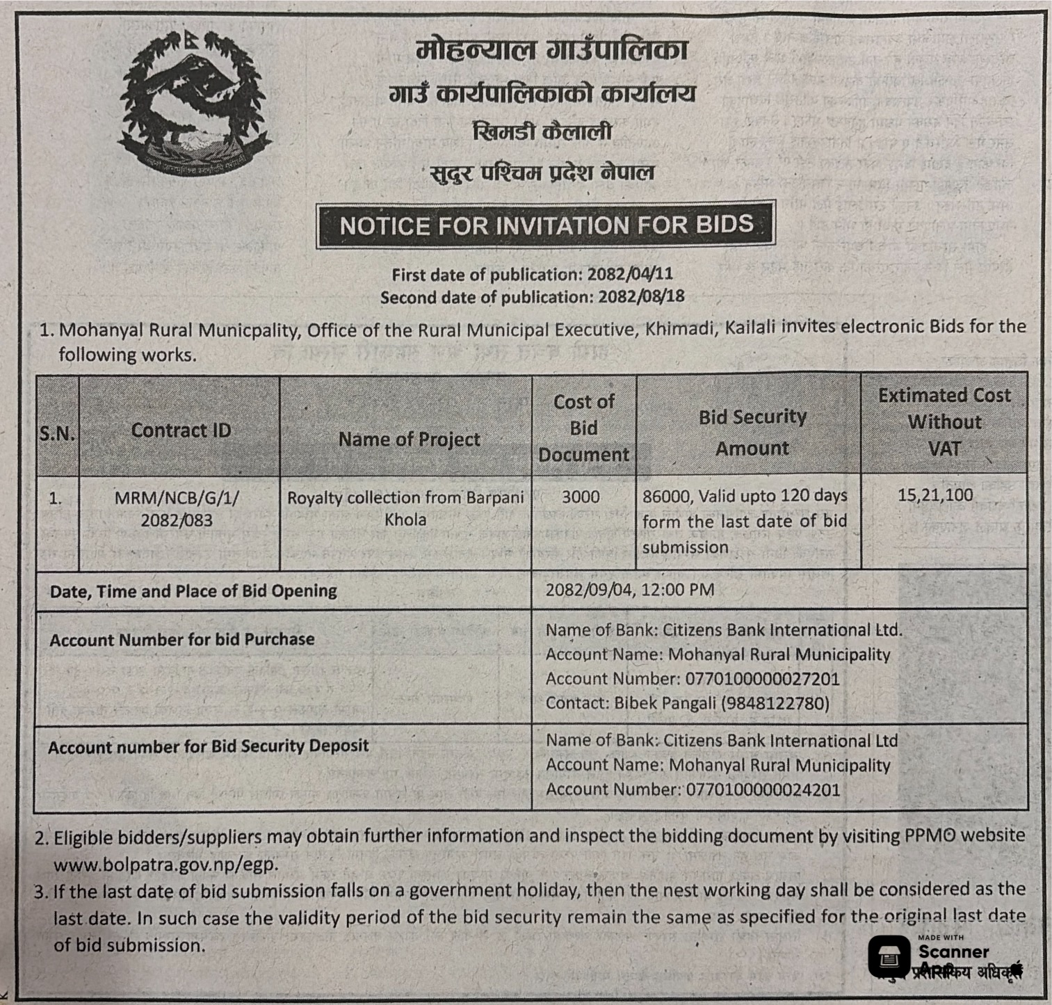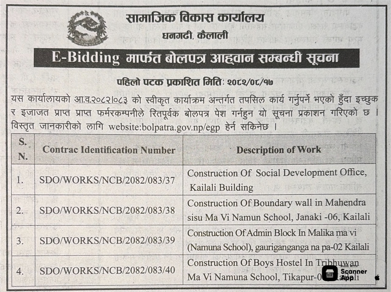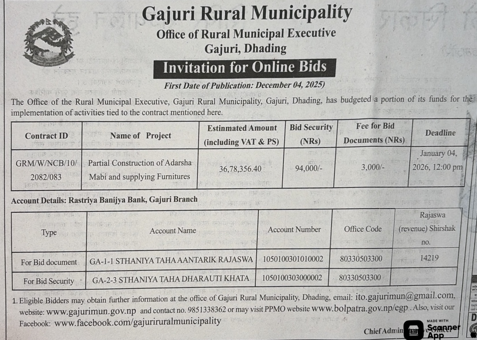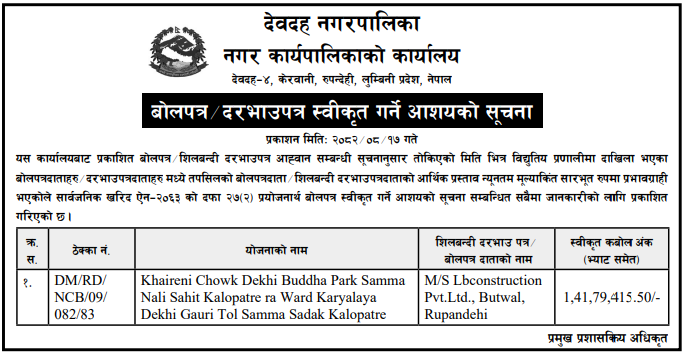 | 5 | Gadhawa Gaupalika | Ramnagar hadaiya,gobindanagar,khadgapur prashehani basti bikash gadhawa-04 Dang | 03/12/2025 | PPMO | 04/01/2026 | Click Here | |