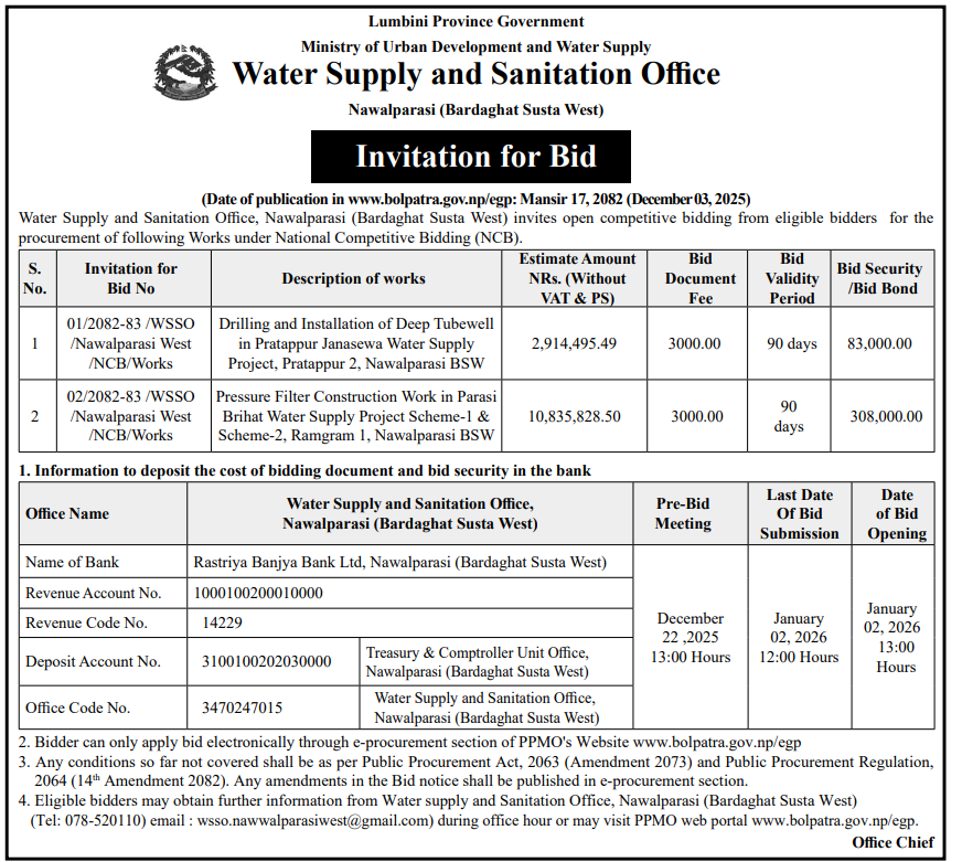| 31 | Water Supply and Sanitation Office, Nawalparasi, Bardaghat Susta West | Drilling and Installation of Deep Tubewell in Pratappur-Janasewa Water Supply Project, Pratappur Rural-Municipality-02, Nawalparasi West | 03/12/2025 | PPMO | 02/01/2026 | Click Here | |