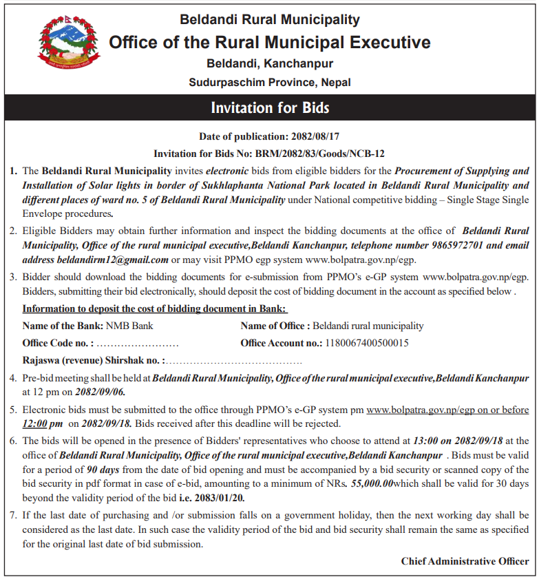 | 258 | Beldandi Rural Municipality, Kanchanpur | Supplying and Installation of Solar lights in border of Sukhlaphanta National Park located in Beldandi Rural Municipality and different places of ward no. 5 of Beldandi Rural Municipality. | 03/12/2025 | PPMO | 02/01/2026 | Click Here | |