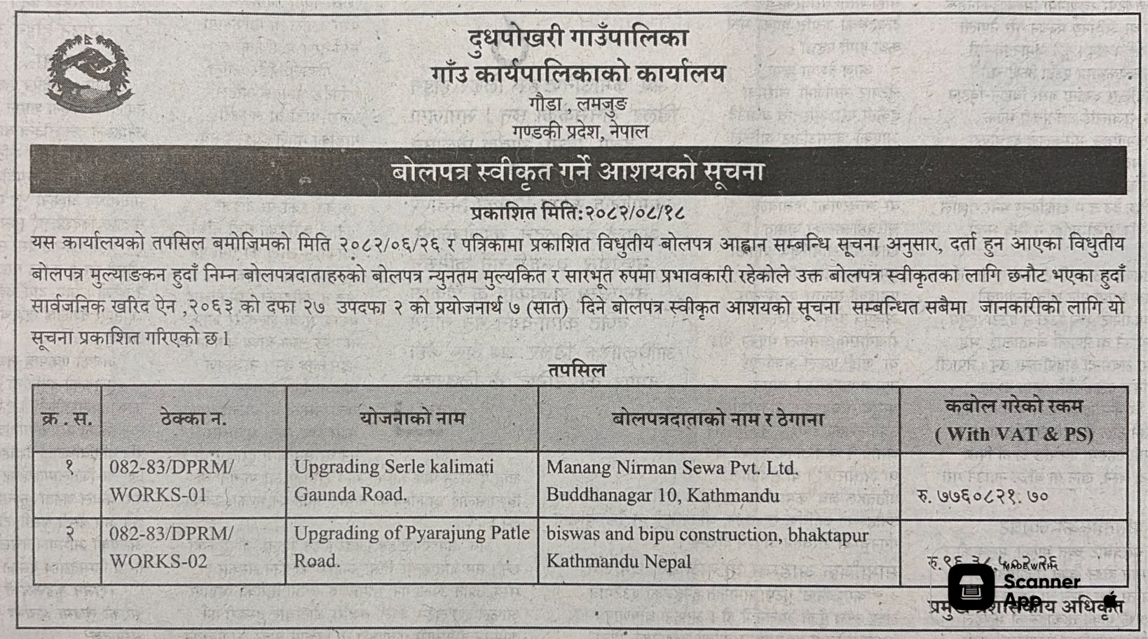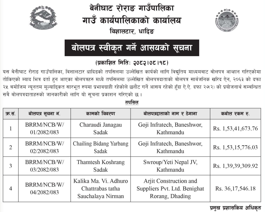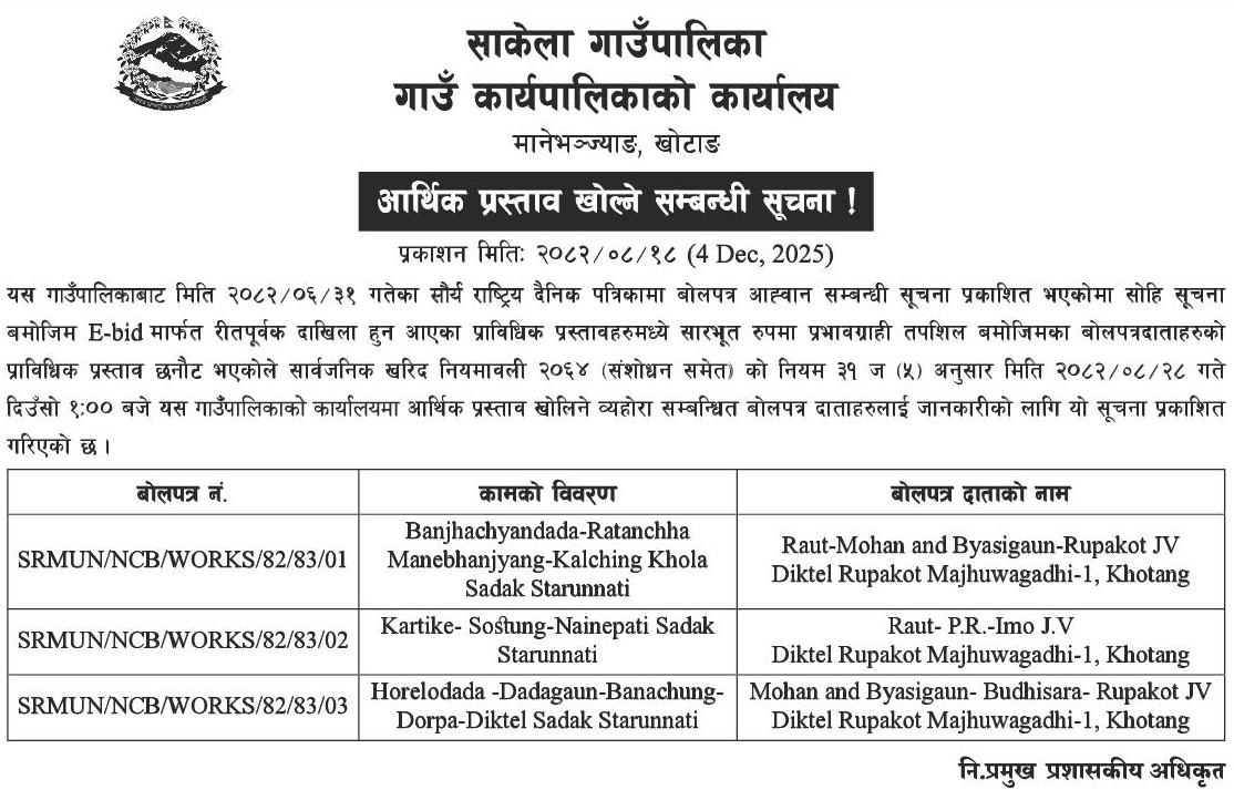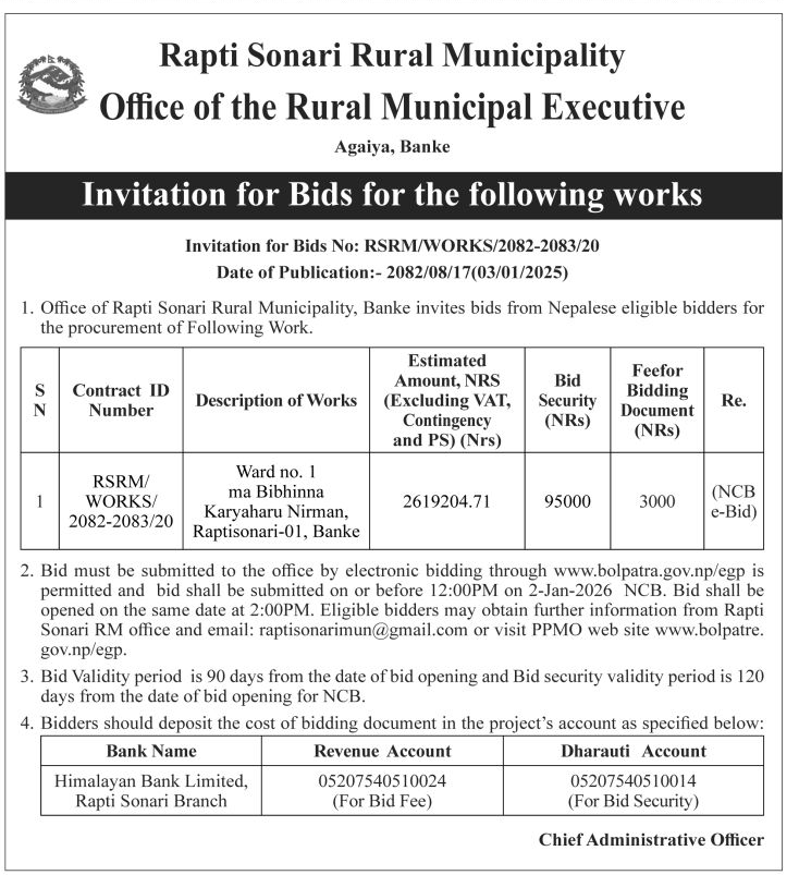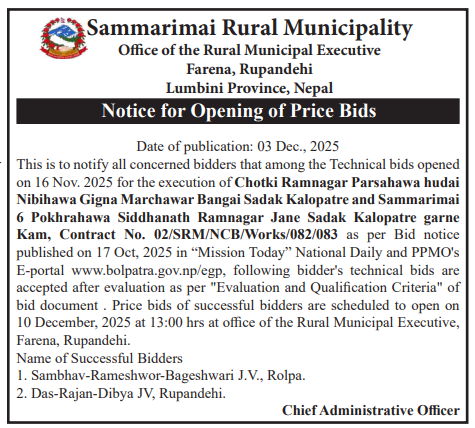 | 25 | Sarumarani Rural Municipality | Aairawati Baddanda Puthakhola Dang Sadak Starunnati Yojana | 03/12/2025 | PPMO | 04/01/2026 | Click Here | |
