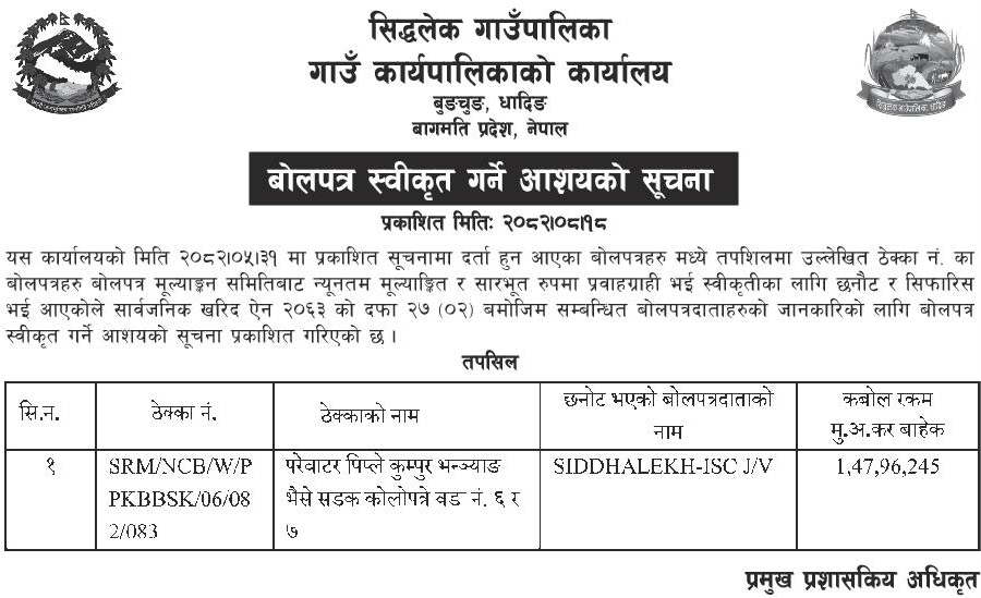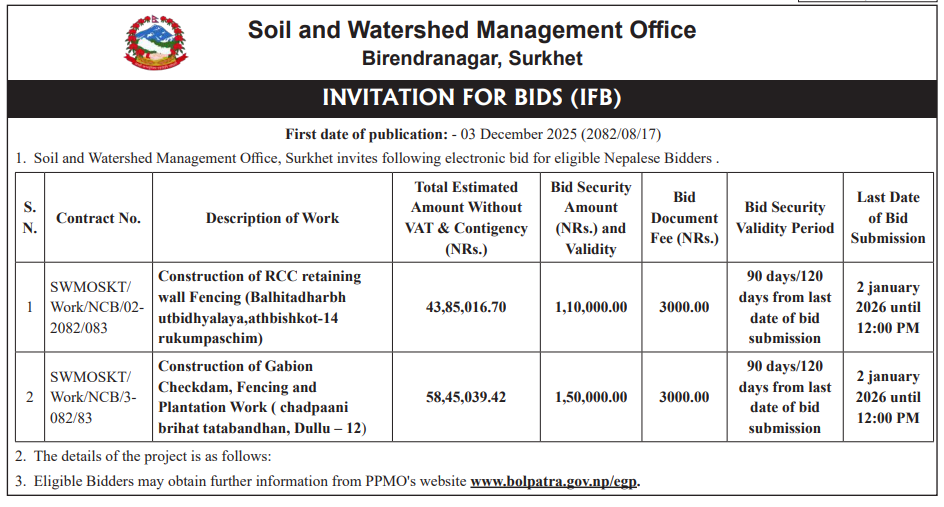 | 51 | Aathbiskot Municipality | Construction of Suwakhola-Silagaun Road at Aathbiskot Municipality-11,Rukum (Western Part). | 03/12/2025 | PPMO | 02/01/2026 | Click Here | |