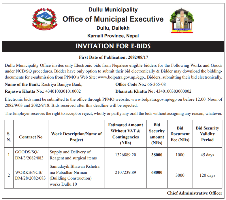 | 280 | Dullu Municipality Office | Supply and Delivery of Reagent and surgical items | 03/12/2025 | PPMO | 18/12/2025 | Click Here | |