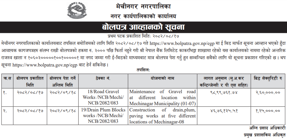 | 37 | Mechinagar Municipality Jhapa | Maintenance of Gravel road at different location within Mechinagar Municipality(01-07) | 03/12/2025 | PPMO | 02/01/2026 | Click Here | |